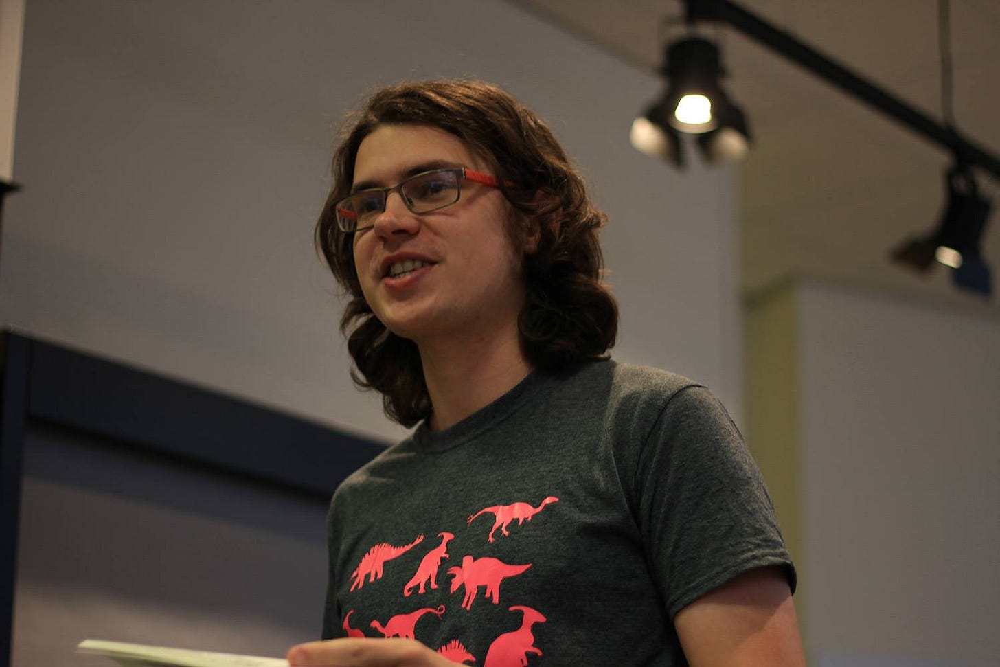 I never followed up on it, but not long after I heard the song I had my own idea: to get those two lines cross-stitched and hung on the wall of my office. In 2016 I’d already started teaching undergraduate students while I finished my PhD between Birmingham and Stratford. I could work plenty of other jobs, of course, but just as there isn’t any money in the independent scene, there wasn’t much in writing, and becoming an academic along the way seemed like one of the most viable ways to keep it as a central part of my life (a fair proportion of poets I know my own age have done something similar.) By this point, although I was still oscillating between early modern studies and creative writing, I was publishing in both fields, and it was pretty clear that I now expected my professional life to turn around one or the other, or both. This picture of me reading children’s poems at a Blackwell’s bookshop in Holborn - in full flow and in dinosaur T-shirt - was on the homepage on my first professional website that year, which seems indicative.